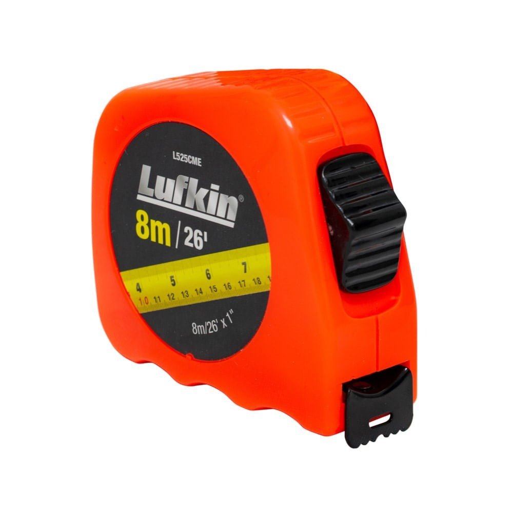Flexómetro Lufkin 8 Metros L525CME FLEX, Longitud 8m/26′ x 1″, Carcasa plástica ABS, Color naranja HiViz, Soporta caídas hasta de 1.8m, sistema métrico decimal e inglés, cinta elaborada en acero templado de alta calidad con revestimiento Epóxico.